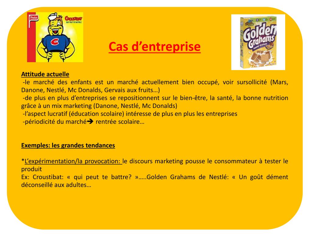 Cas d’entreprise Attitude actuelle -le marché des enfants est un marché actuellement bien occupé, voir sursollicité (Mars, Danone, Nestlé, Mc Donalds, Gervais aux fruits…) -de plus en plus d’entreprises se repositionnent sur le bien-être, la santé, la bonne nutrition grâce à un mix marketing (Danone, Nestlé, Mc Donalds) -l’aspect lucratif (éducation scolaire) intéresse de plus en plus les entreprises -périodicité du marché rentrée scolaire… Exemples: les grandes tendances *L’expérimentation/la provocation: le discours marketing pousse le consommateur à tester le produit Ex: Croustibat: « qui peut te battre? »…..Golden Grahams de Nestlé: « Un goût dément déconseillé aux adultes…