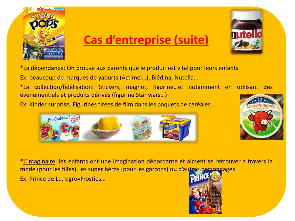 Cas d’entreprise (suite) *La dépendance: On prouve aux parents que le produit est vital pour leurs enfants Ex: beaucoup de marques de yaourts (Actimel…), Blédina, Nutella… *La collection/fidélisation: Stickers, magnet, figurine…et notamment en utilisant des évenementiels et produits dérivés (figurine Star wars…) Ex: Kinder surprise, Figurines tirées de film dans les paquets de céréales… *L’imaginaire: les enfants ont une imagination débordante et aiment se retrouver à travers la mode (pour les filles), les super héros (pour les garçons) ou d’autres personnages Ex: Prince de Lu, tigre=Frosties…