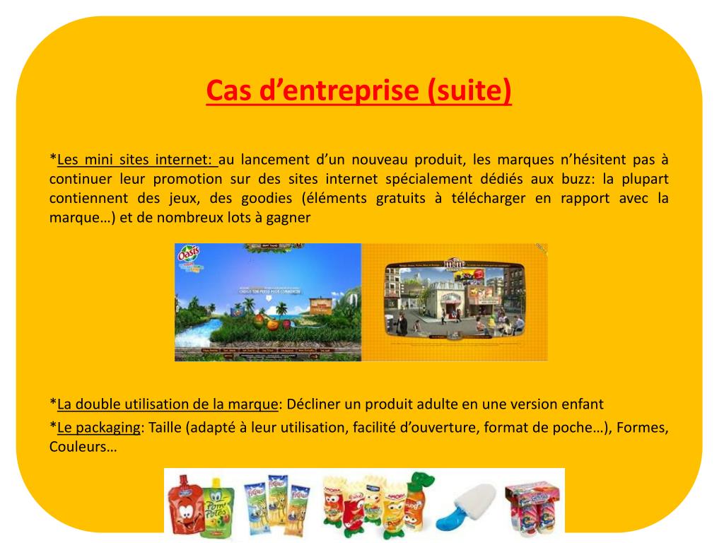 Cas d’entreprise (suite) *Les mini sites internet: au lancement d’un nouveau produit, les marques n’hésitent pas à continuer leur promotion sur des sites internet spécialement dédiés aux buzz: la plupart contiennent des jeux, des goodies (éléments gratuits à télécharger en rapport avec la marque…) et de nombreux lots à gagner *La double utilisation de la marque: Décliner un produit adulte en une version enfant *Le packaging: Taille (adapté à leur utilisation, facilité d’ouverture, format de poche…), Formes, Couleurs…
