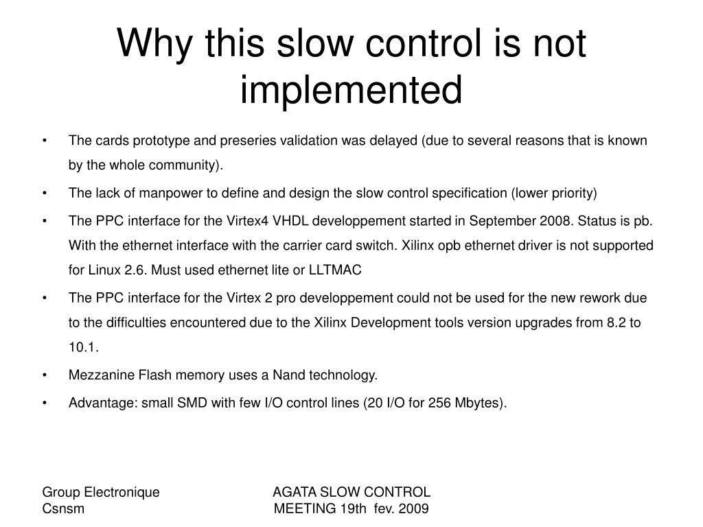 Why this slow control is not implemented • The cards prototype and preseries validation was delayed (due to several reasons that is known by the whole community). • The lack of manpower to define and design the slow control specification (lower priority) • The PPC interface for the Virtex4 VHDL developpement started in September 2008. Status is pb. With the ethernet interface with the carrier card switch. Xilinx opb ethernet driver is not supported for Linux 2.6. Must used ethernet lite or LLTMAC • The PPC interface for the Virtex 2 pro developpement could not be used for the new rework due to the difficulties encountered due to the Xilinx Development tools version upgrades from 8.2 to 10.1. • Mezzanine Flash memory uses a Nand technology. • Advantage: small SMD with few I/O control lines (20 I/O for 256 Mbytes). AGATA SLOW CONTROL MEETING 19th fev. 2009