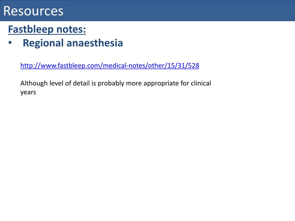 Resources • Fastbleep notes: • Regional anaesthesia http://www.fastbleep.com/medical-notes/other/15/31/528 Although level of detail is probably more appropriate for clinical years