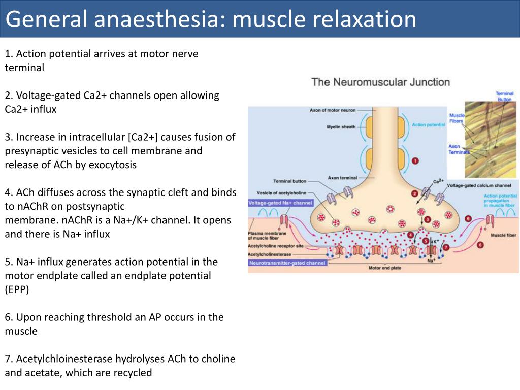 General anaesthesia: muscle relaxation 1. Action potential arrives at motor nerve terminal 2. Voltage-gated Ca2+ channels open allowing Ca2+ influx 3. Increase in intracellular [Ca2+] causes fusion of presynaptic vesicles to cell membrane and release of ACh by exocytosis 4. ACh diffuses across the synaptic cleft and binds to nAChR on postsynaptic membrane. nAChR is a Na+/K+ channel. It opens and there is Na+ influx 5. Na+ influx generates action potential in the motor endplate called an endplate potential (EPP) 6. Upon reaching threshold an AP occurs in the muscle 7. Acetylchloinesterase hydrolyses ACh to choline and acetate, which are recycled
