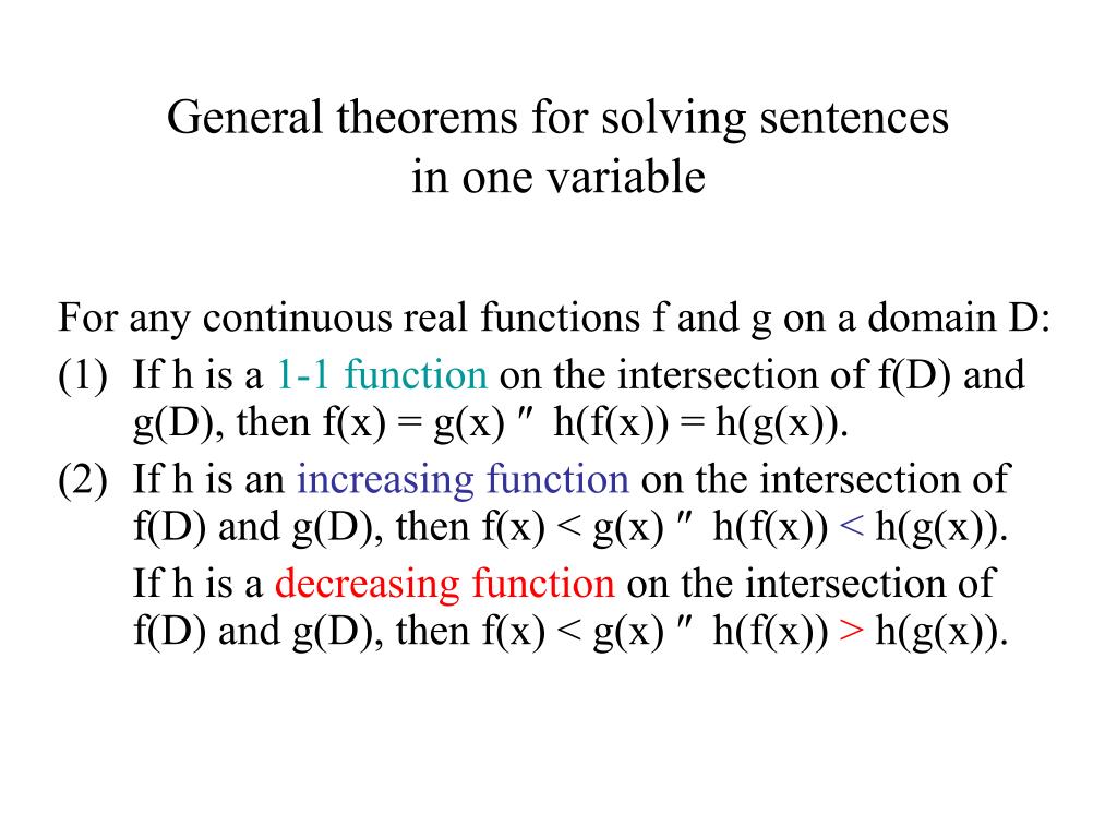 General theorems for solving sentences in one variable For any continuous real functions f and g on a domain D: (1) If h is a 1-1 function on the intersection of f(D) and g(D), then f(x) = g(x) ˛ h(f(x)) = h(g(x)). (2) If h is an increasing function on the intersection of f(D) and g(D), then f(x) < g(x) ˛ h(f(x)) < h(g(x)). If h is a decreasing function on the intersection of f(D) and g(D), then f(x) < g(x) ˛ h(f(x)) > h(g(x)).