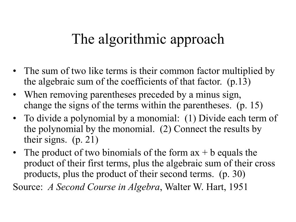 The algorithmic approach • The sum of two like terms is their common factor multiplied by the algebraic sum of the coefficients of that factor. (p.13) • When removing parentheses preceded by a minus sign, change the signs of the terms within the parentheses. (p. 15) • To divide a polynomial by a monomial: (1) Divide each term of the polynomial by the monomial. (2) Connect the results by their signs. (p. 21) • The product of two binomials of the form ax + b equals the product of their first terms, plus the algebraic sum of their cross products, plus the product of their second terms. (p. 30) Source: A Second Course in Algebra, Walter W. Hart, 1951