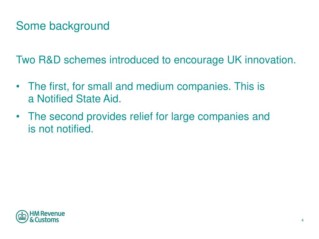 Some background Two R&D schemes introduced to encourage UK innovation. • The first, for small and medium companies. This is a Notified State Aid. • The second provides relief for large companies and is not notified.