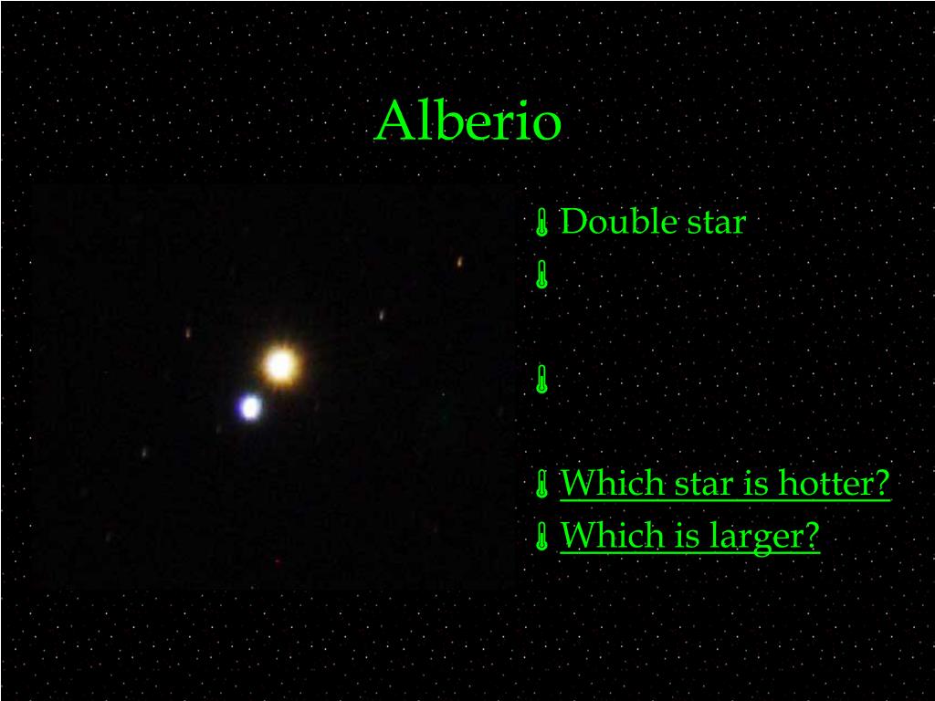 Alberio • Double star • Which star is hotter? • Which is larger?