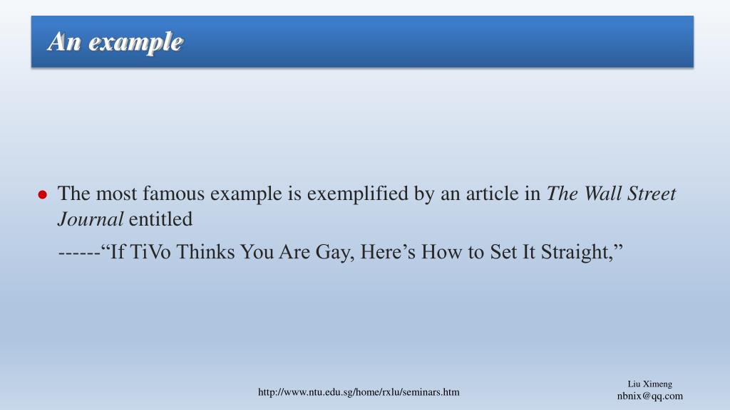 An example • The most famous example is exemplified by an article in The Wall Street Journal entitled ------“If TiVo Thinks You Are Gay, Here’s How to Set It Straight,”