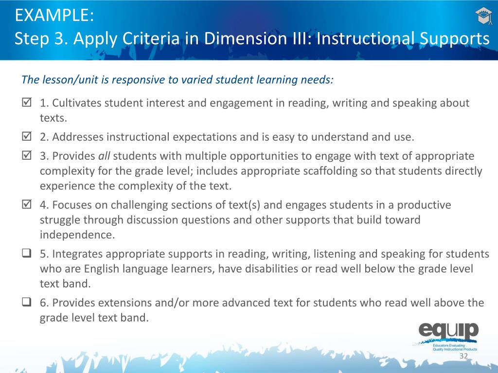 EXAMPLE:Step 3. Apply Criteria in Dimension III: Instructional Supports The lesson/unit is responsive to varied student learning needs: • 1. Cultivates student interest and engagement in reading, writing and speaking about texts. • 2. Addresses instructional expectations and is easy to understand and use. • 3. Provides all students with multiple opportunities to engage with text of appropriate complexity for the grade level; includes appropriate scaffolding so that students directly experience the complexity of the text. • 4. Focuses on challenging sections of text(s) and engages students in a productive struggle through discussion questions and other supports that build toward independence. • 5. Integrates appropriate supports in reading, writing, listening and speaking for students who are English language learners, have disabilities or read well below the grade level text band. • 6. Provides extensions and/or more advanced text for students who read well above the grade level text band.
