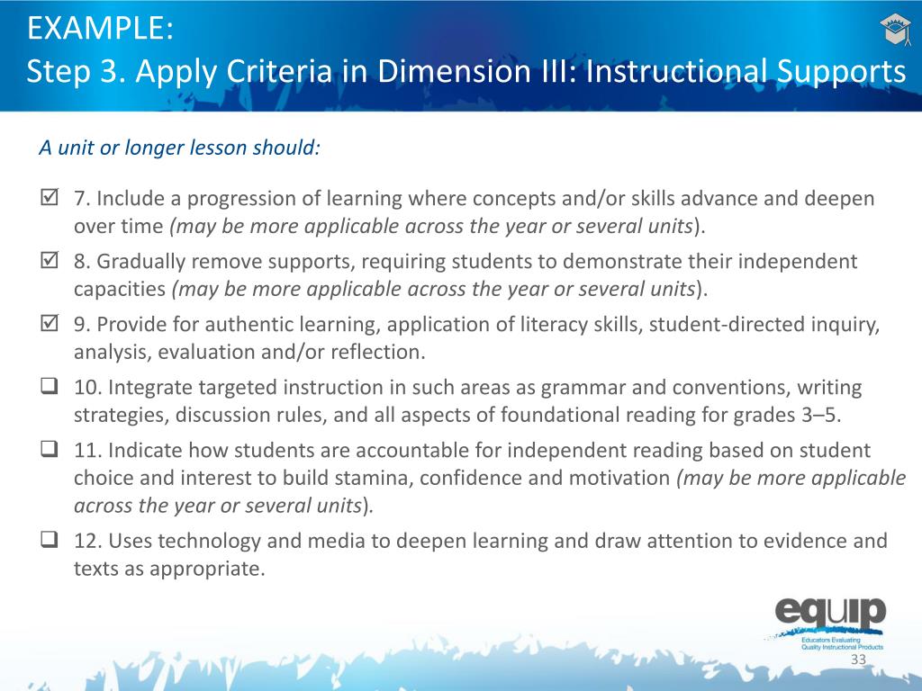 EXAMPLE:Step 3. Apply Criteria in Dimension III: Instructional Supports A unit or longer lesson should: • 7. Include a progression of learning where concepts and/or skills advance and deepen over time (may be more applicable across the year or several units). • 8. Gradually remove supports, requiring students to demonstrate their independent capacities (may be more applicable across the year or several units). • 9. Provide for authentic learning, application of literacy skills, student-directed inquiry, analysis, evaluation and/or reflection. • 10. Integrate targeted instruction in such areas as grammar and conventions, writing strategies, discussion rules, and all aspects of foundational reading for grades 3–5. • 11. Indicate how students are accountable for independent reading based on student choice and interest to build stamina, confidence and motivation (may be more applicable across the year or several units). • 12. Uses technology and media to deepen learning and draw attention to evidence and texts as appropriate.