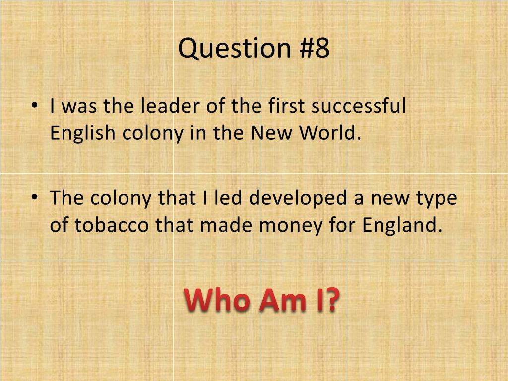 Question #8 • I was the leader of the first successful English colony in the New World. • The colony that I led developed a new type of tobacco that made money for England. Who Am I?