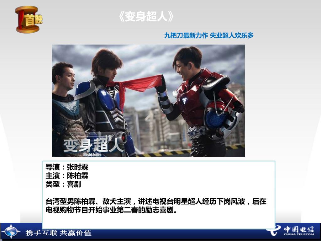 《变身超人》 九把刀最新力作 失业超人欢乐多 导演:张时霖 主演:陈柏霖 类型:喜剧 台湾型男陈柏霖、敖犬主演,讲述电视台明星超人经历下岗风波,后在电视购物节目开始事业第二春的励志喜剧。