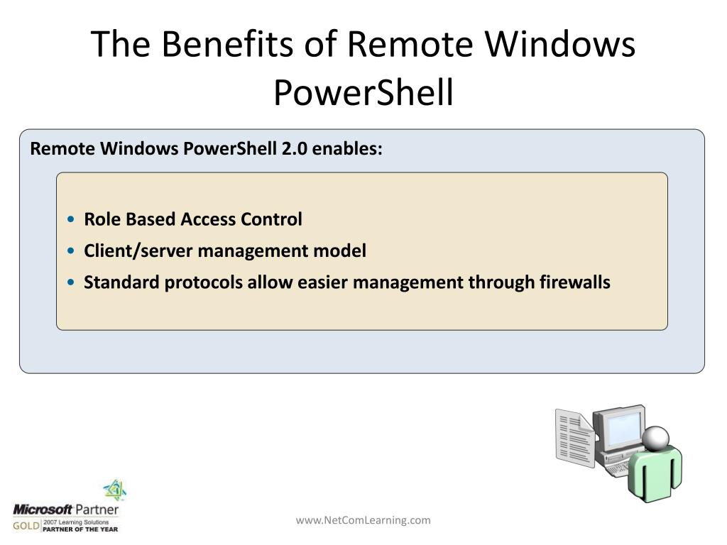 The Benefits of Remote Windows PowerShell Remote Windows PowerShell 2.0 enables: • Role Based Access Control • Client/server management model • Standard protocols allow easier management through firewalls www.NetComLearning.com