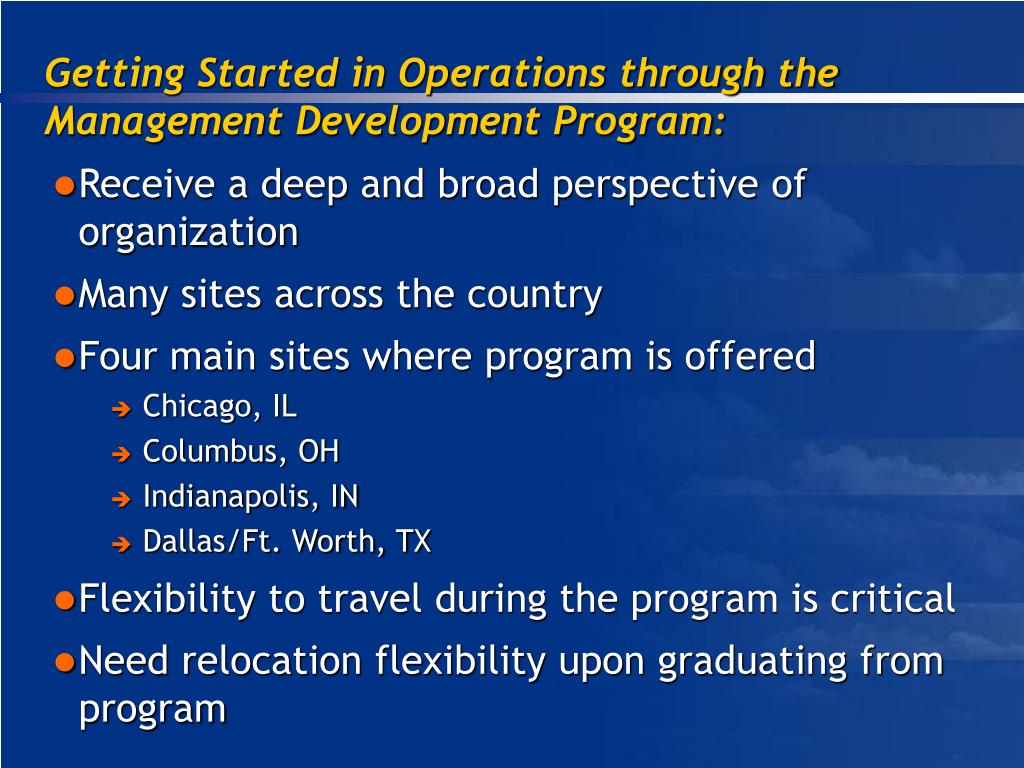 Getting Started in Operations through the Management Development Program: • Receive a deep and broad perspective of organization • Many sites across the country • Four main sites where program is offered • Chicago, IL • Columbus, OH • Indianapolis, IN • Dallas/Ft. Worth, TX • Flexibility to travel during the program is critical • Need relocation flexibility upon graduating from program