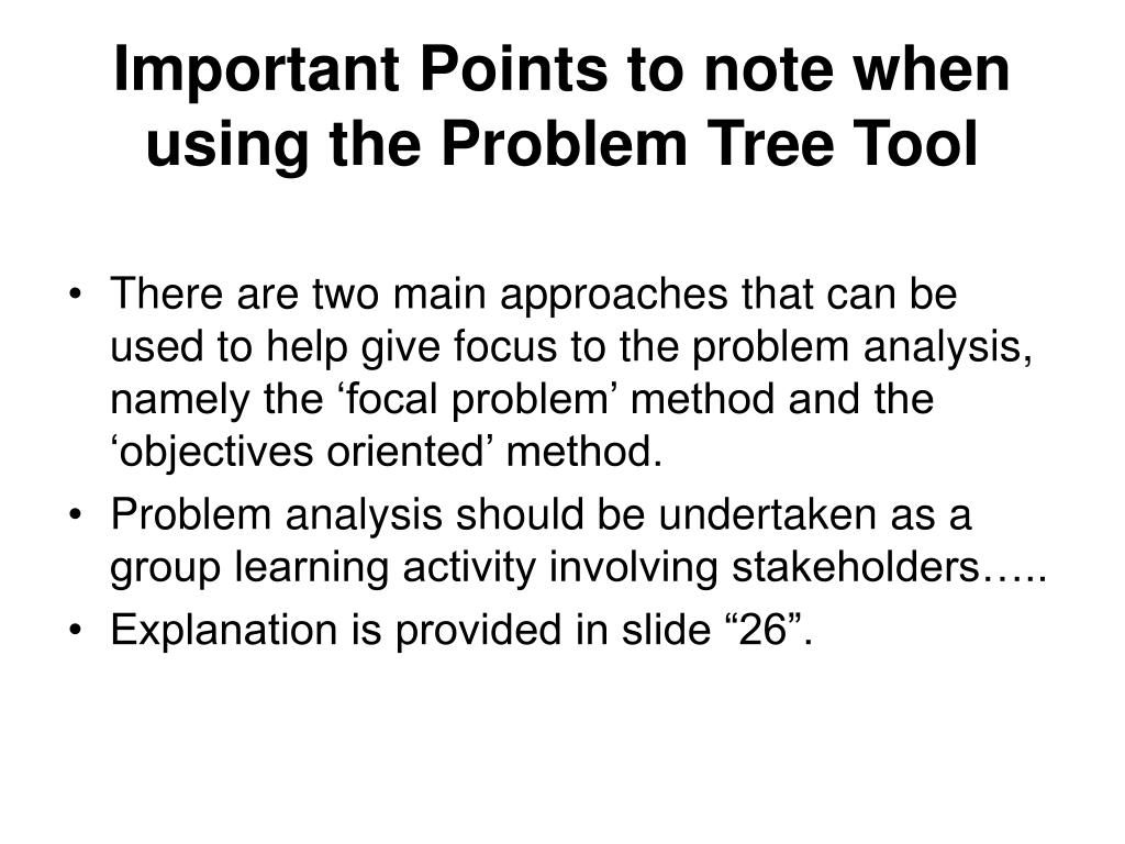 Important Points to note when using the Problem Tree Tool • There are two main approaches that can be used to help give focus to the problem analysis, namely the ‘focal problem’ method and the ‘objectives oriented’ method. • Problem analysis should be undertaken as a group learning activity involving stakeholders….. • Explanation is provided in slide “26”.