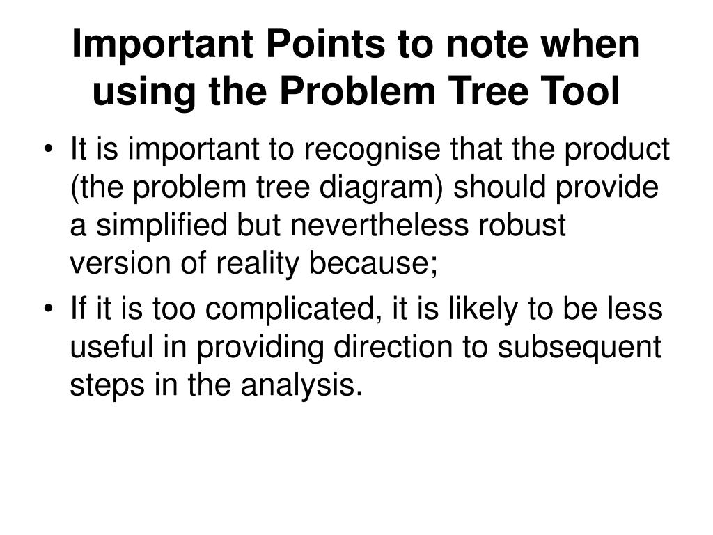 Important Points to note when using the Problem Tree Tool • It is important to recognise that the product (the problem tree diagram) should provide a simplified but nevertheless robust version of reality because; • If it is too complicated, it is likely to be less useful in providing direction to subsequent steps in the analysis.