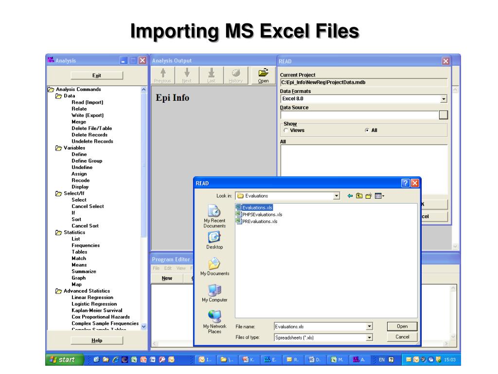 Epi Info™ Readable File Formats • Access 97, 2000 • dBASE 5.0 • dBASE III • dBASE IV • Epi 2000 • Epi 6 Rec • MS Excel 3 (95) • MS Excel 4 (98) • MS Excel 5 (2000) • MS Excel 8 (2003) • FoxPro 2 • FoxPro 2.5 • FoxPro 3.0 • HTML • ODBC • Paradox 3.x • Paradox 4.x • Paradox 5.x • Text • Text (Delimited) • Text (Fixed)