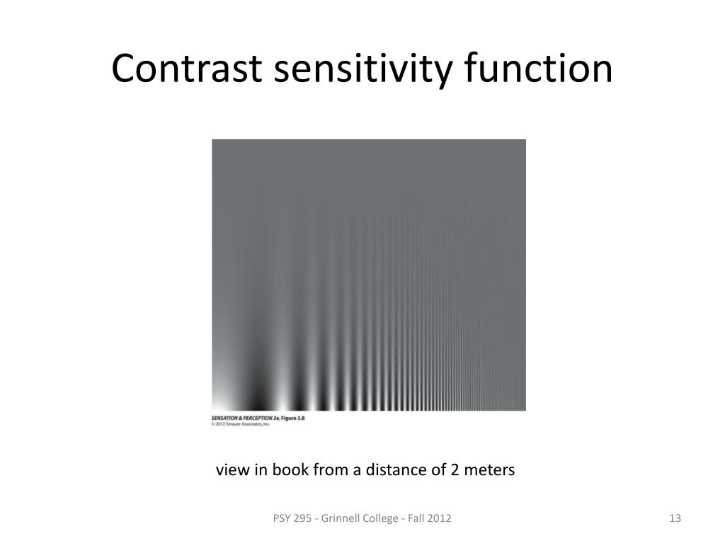 Contrast • Contrast threshold is % difference in luminance between light and dark bars needed to detect a grating • Contrast sensitivity is measured as reciprocal of threshold • Intuitively, one might expect highest sensitivity for low spatial frequencies (wide stripes) PSY 295 - Grinnell College - Fall 2012
