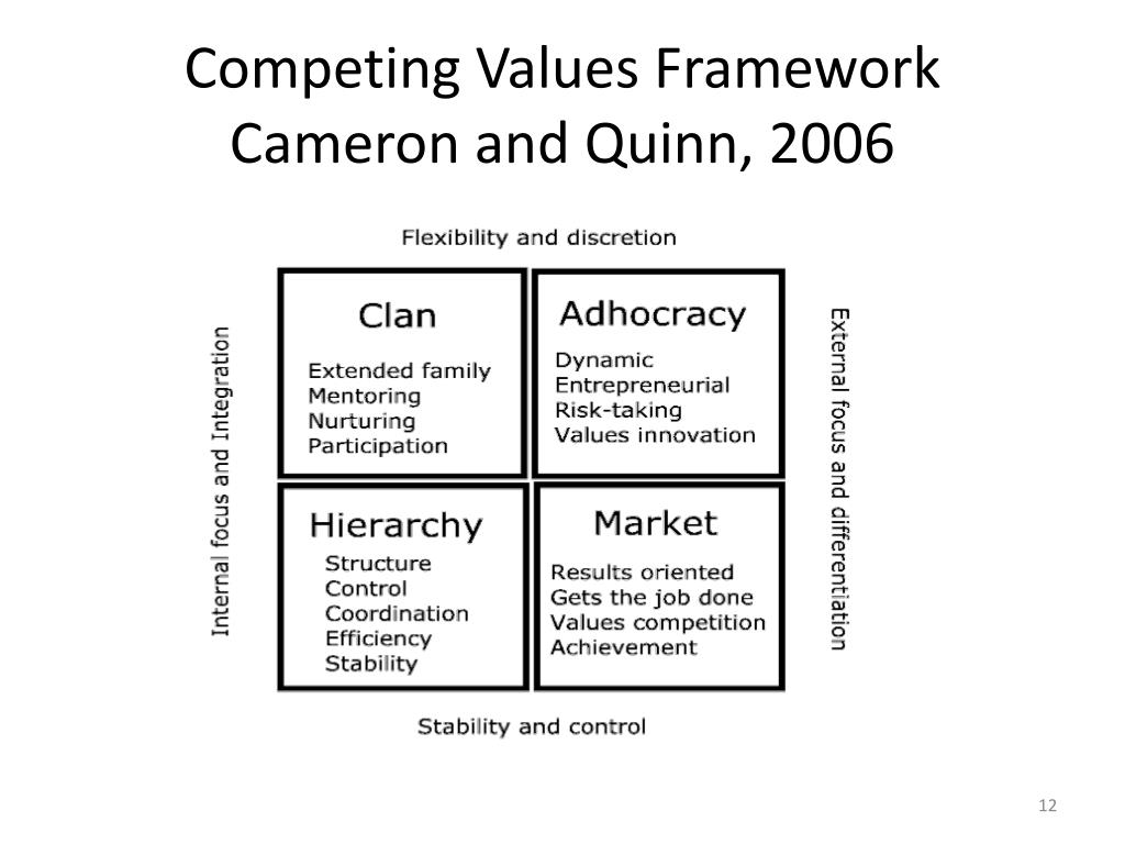 Adhocracy Culture • Dynamic, entrepreneurial • Leader: innovator, visionary, entrepreneur • Value: innovation, agility, transformation • Innovativeness, vision and new resources Cameron and Quinn, 2006
