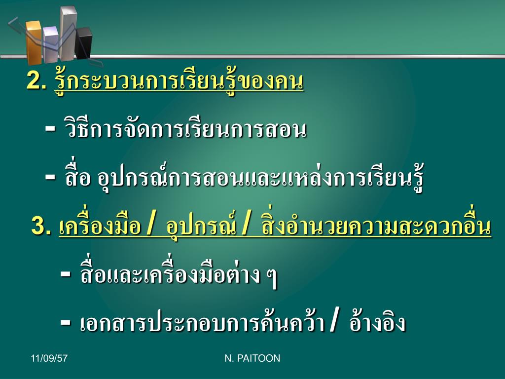 2. รู้กระบวนการเรียนรู้ของคน - วิธีการจัดการเรียนการสอน - สื่อ อุปกรณ์การสอนและแหล่งการเรียนรู้ 3. เครื่องมือ / อุปกรณ์ / สิ่งอำนวยความสะดวกอื่น - สื่อและเครื่องมือต่าง ๆ - เอกสารประกอบการค้นคว้า / อ้างอิง 11/09/57 N. PAITOON