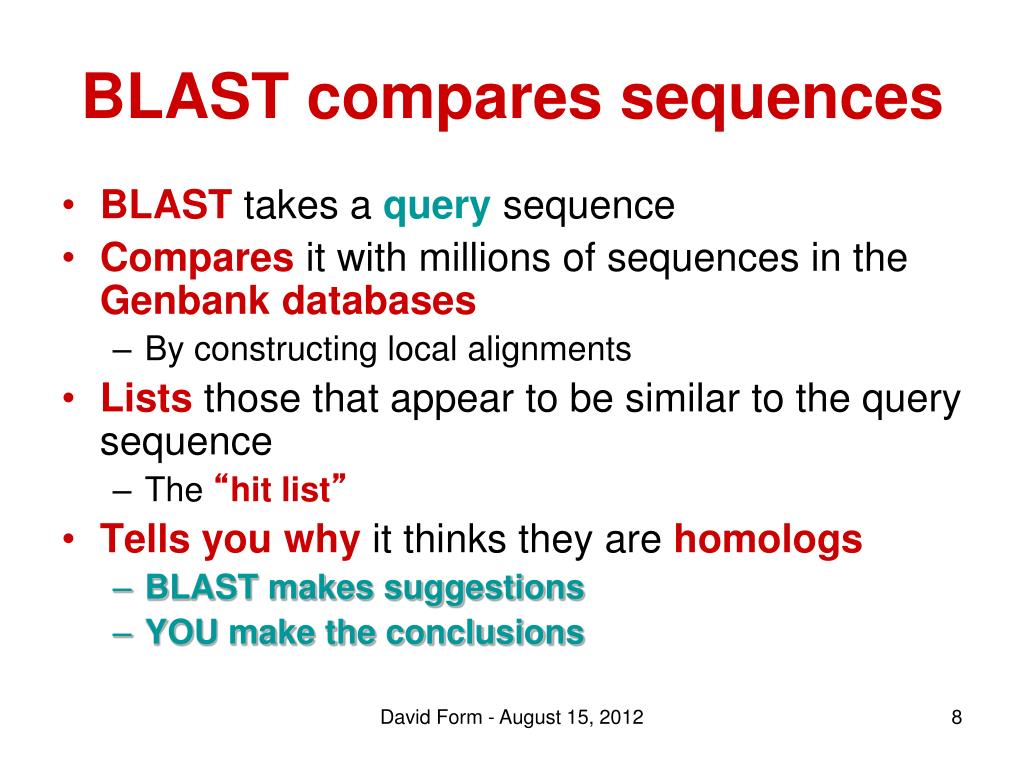 BLAST compares sequences • BLAST takes a query sequence • Compares it with millions of sequences in the Genbank databases • By constructing local alignments • Lists those that appear to be similar to the query sequence • The “hit list” • Tells you why it thinks they are homologs • BLAST makes suggestions • YOU make the conclusions David Form - August 15, 2012
