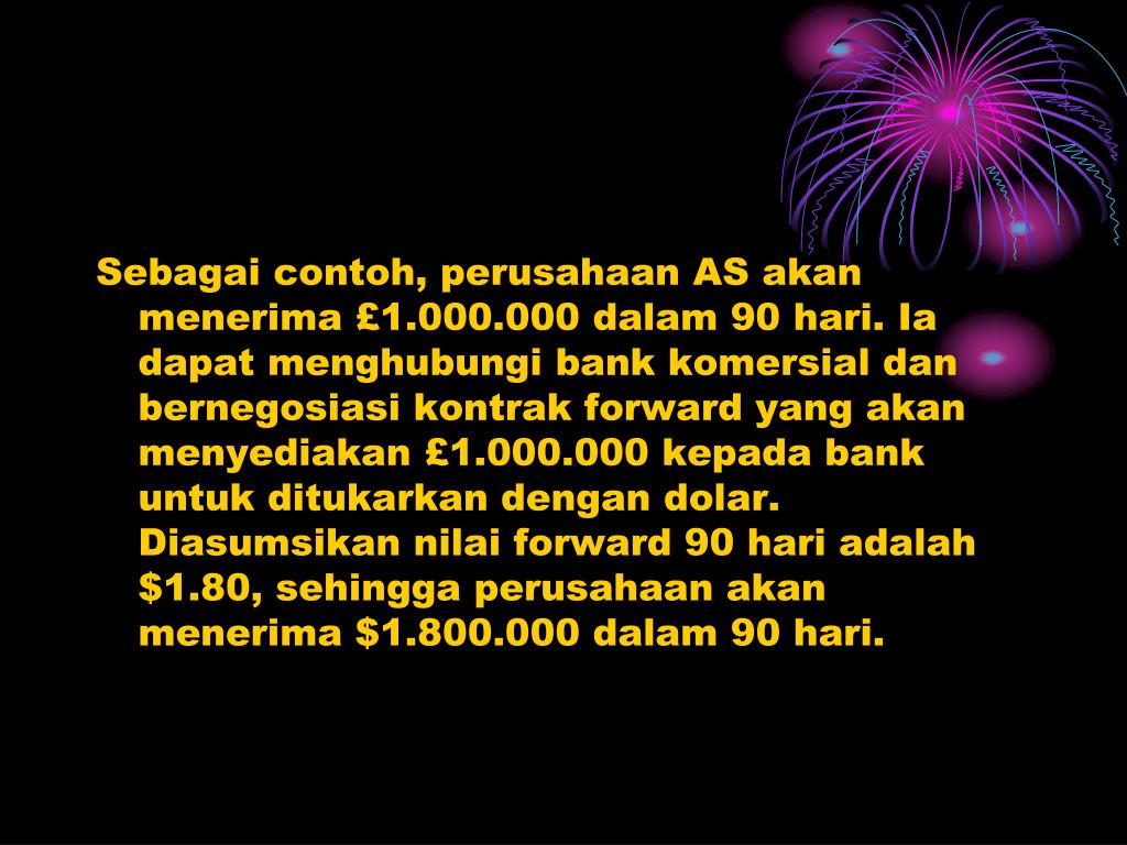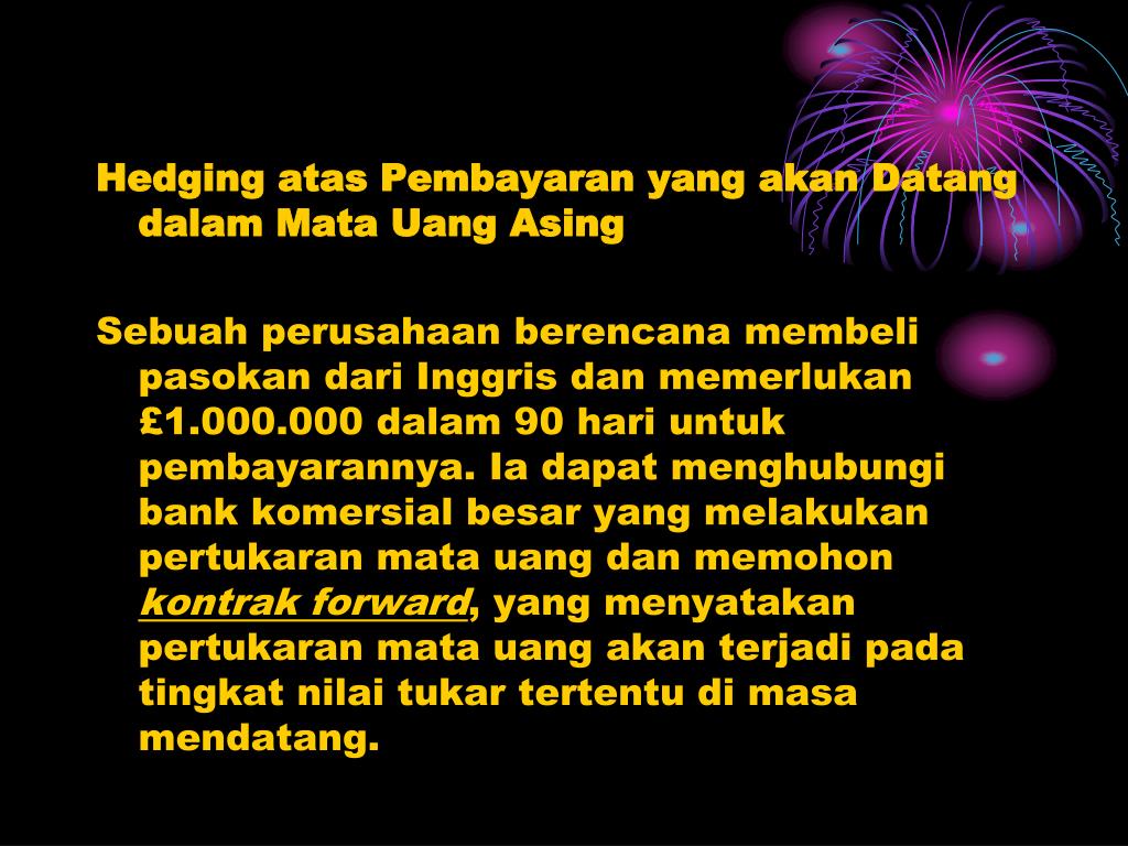 Hedging atas Pembayaran yang akan Datang dalam Mata Uang Asing Sebuah perusahaan berencana membeli pasokan dari Inggris dan memerlukan £1.000.000 dalam 90 hari untuk pembayarannya. Ia dapat menghubungi bank komersial besar yang melakukan pertukaran mata uang dan memohon kontrak forward, yang menyatakan pertukaran mata uang akan terjadi pada tingkat nilai tukar tertentu di masa mendatang.
