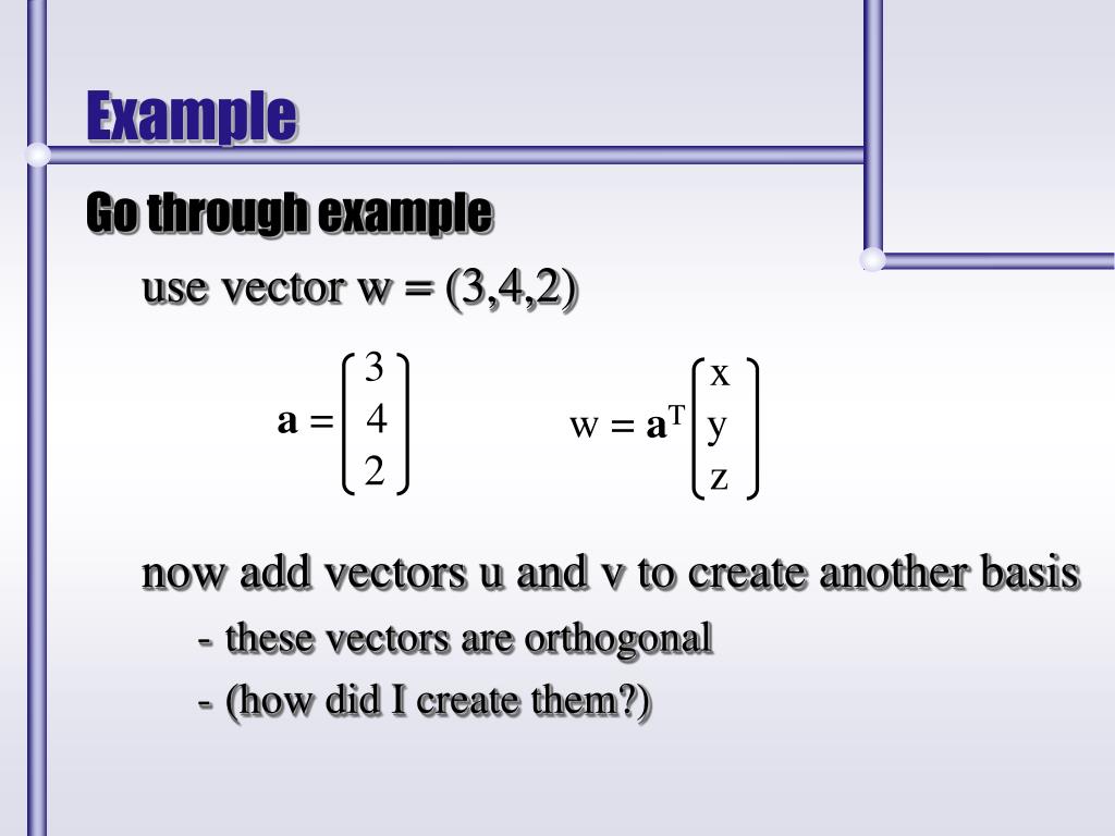 3 a = 4 2 x w = aT y z Example • Go through example use vector w = (3,4,2) now add vectors u and v to create another basis • these vectors are orthogonal • (how did I create them?)