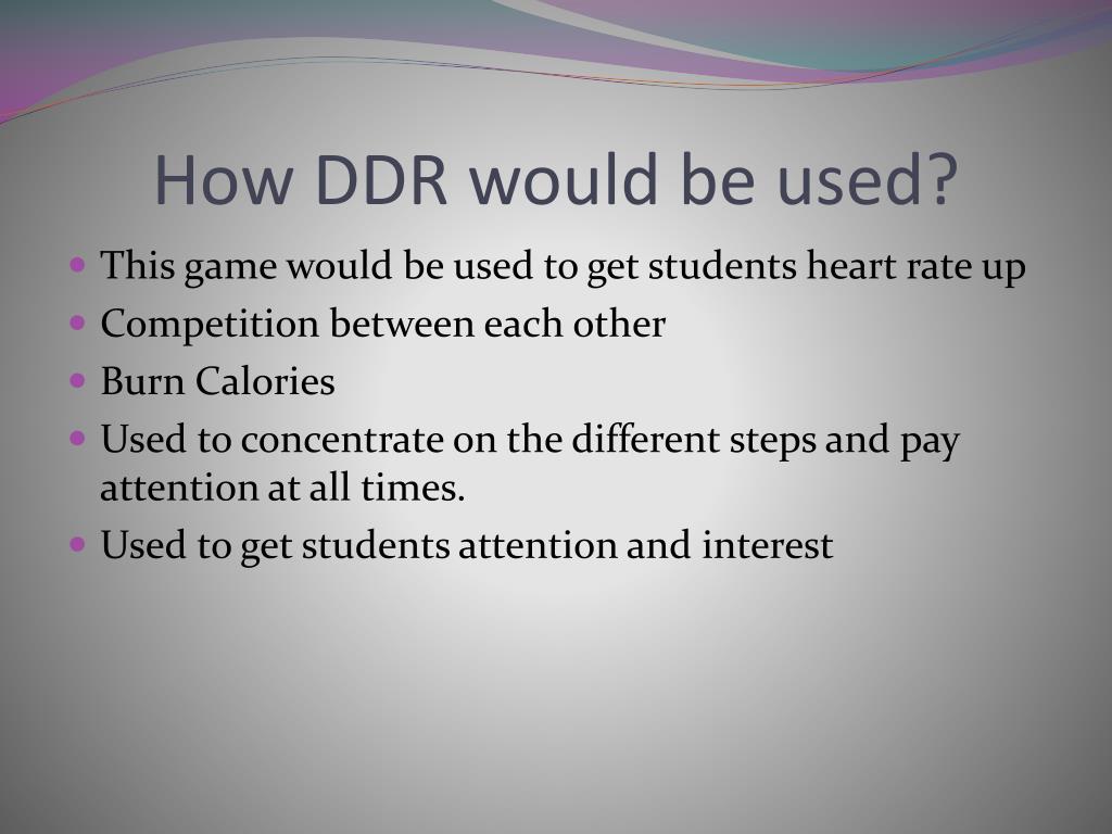 How DDR would be used? • This game would be used to get students heart rate up • Competition between each other • Burn Calories • Used to concentrate on the different steps and pay attention at all times. • Used to get students attention and interest
