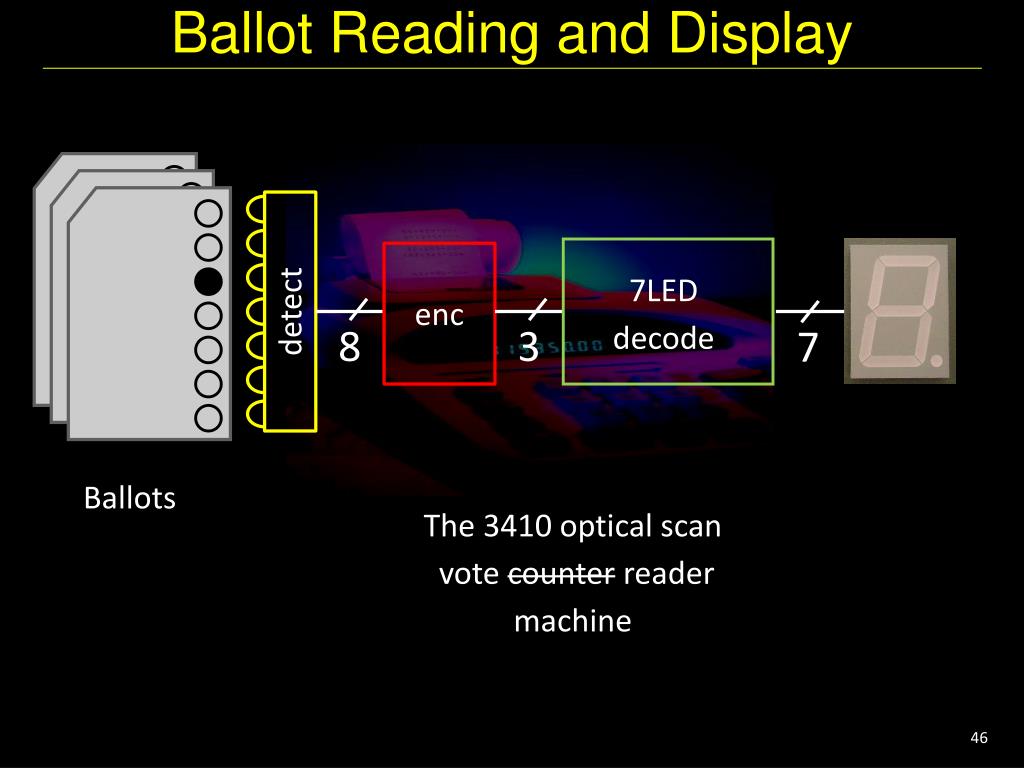 Ballot Reading • Input: paper with a hole in it • Output:number the ballot supervisor can record Ballots The 3410 optical scan vote counter reader machine