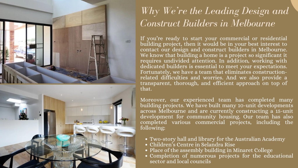 Why We’re the Leading Design and Construct Builders in Melbourne If you’re ready to start your commercial or residential building project, then it would be in your best interest to contact our design and construct builders in Melbourne. We know that building a home is a project so significant it requires undivided attention. In addition, working with dedicated builders is essential to meet your expectations. Fortunately, we have a team that eliminates construction- related difficulties and worries. And we also provide a transparent, thorough, and efficient approach on top of that. Moreover, our experienced team has completed many building projects. We have built many 10-unit developments across Melbourne and are currently constructing a 15-unit development for community housing. Our team has also completed various commercial projects, including the following: Two-story hall and library for the Australian Academy Children’s Centre in Selandra Rise Place of the assembly building in Minaret College Completion of numerous projects for the educational sector and local councils