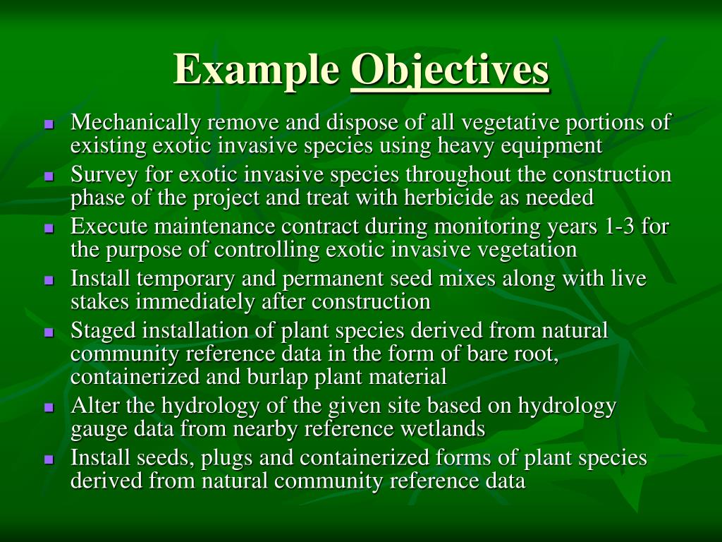 Example Objectives • Mechanically remove and dispose of all vegetative portions of existing exotic invasive species using heavy equipment • Survey for exotic invasive species throughout the construction phase of the project and treat with herbicide as needed • Execute maintenance contract during monitoring years 1-3 for the purpose of controlling exotic invasive vegetation • Install temporary and permanent seed mixes along with live stakes immediately after construction • Staged installation of plant species derived from natural community reference data in the form of bare root, containerized and burlap plant material • Alter the hydrology of the given site based on hydrology gauge data from nearby reference wetlands • Install seeds, plugs and containerized forms of plant species derived from natural community reference data