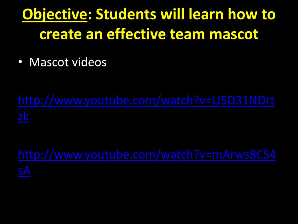 Objective: Students will learn how to create an effective team mascot • Mascot videos http://www.youtube.com/watch?v=U5D31NDrtzk http://www.youtube.com/watch?v=mArws8CS4sA