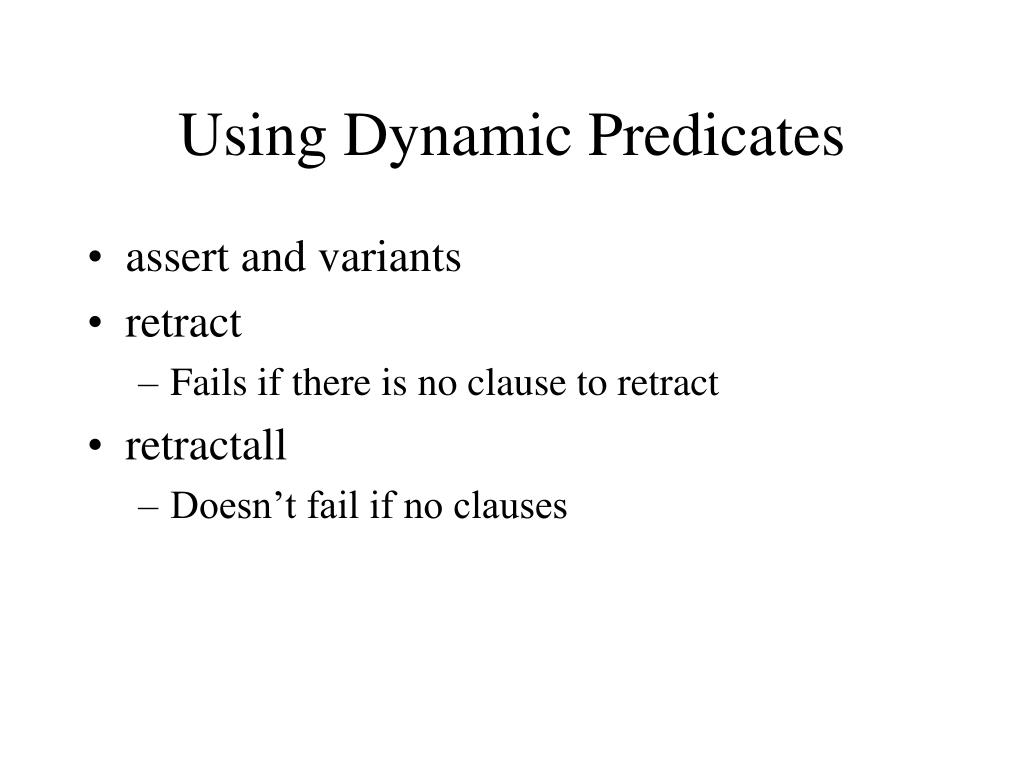 Using Dynamic Predicates • assert and variants • retract • Fails if there is no clause to retract • retractall • Doesn’t fail if no clauses