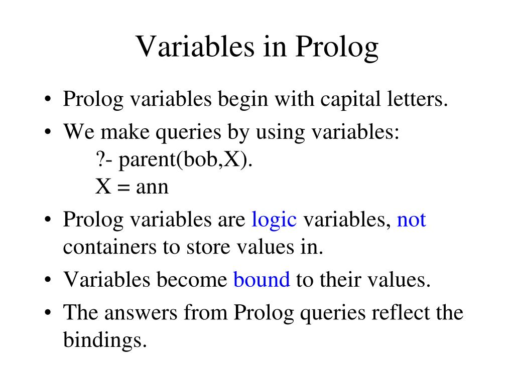 Variables in Prolog • Prolog variables begin with capital letters. • We make queries by using variables: ?- parent(bob,X). X = ann • Prolog variables are logic variables, not containers to store values in. • Variables become bound to their values. • The answers from Prolog queries reflect the bindings.