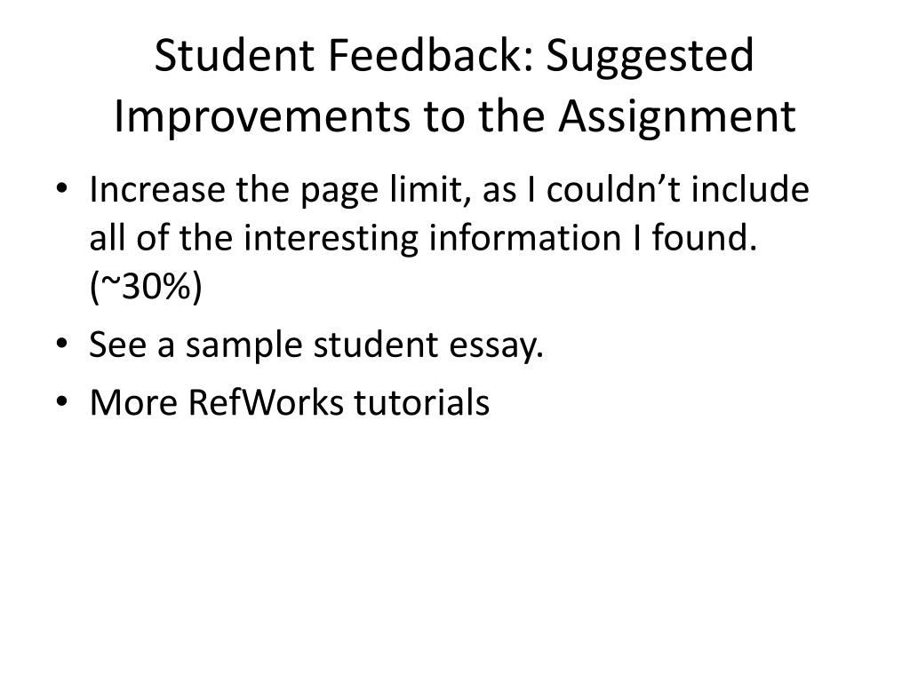 Student Feedback: Suggested Improvements to the Assignment • Increase the page limit, as I couldn’t include all of the interesting information I found. (~30%) • See a sample student essay. • More RefWorks tutorials