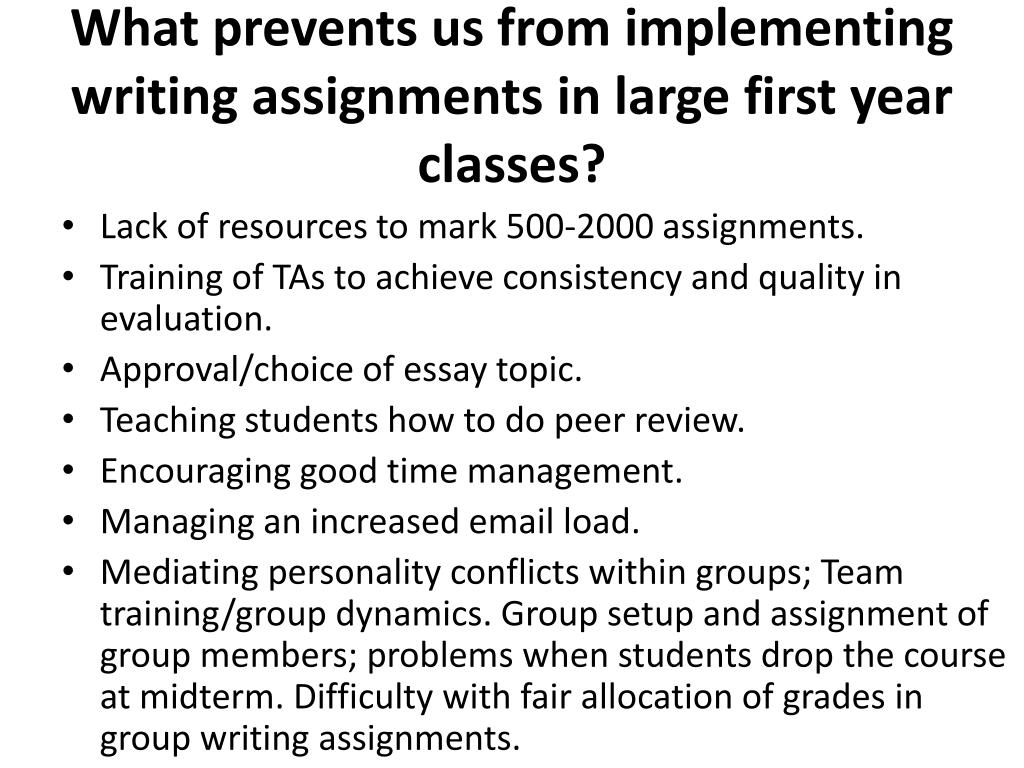 What prevents us from implementing writing assignments in large first year classes? • Lack of resources to mark 500-2000 assignments. • Training of TAs to achieve consistency and quality in evaluation. • Approval/choice of essay topic. • Teaching students how to do peer review. • Encouraging good time management. • Managing an increased email load. • Mediating personality conflicts within groups; Team training/group dynamics. Group setup and assignment of group members; problems when students drop the course at midterm. Difficulty with fair allocation of grades in group writing assignments.