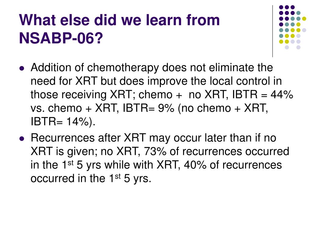 What else did we learn from NSABP-06? • Addition of chemotherapy does not eliminate the need for XRT but does improve the local control in those receiving XRT; chemo + no XRT, IBTR = 44% vs. chemo + XRT, IBTR= 9% (no chemo + XRT, IBTR= 14%). • Recurrences after XRT may occur later than if no XRT is given; no XRT, 73% of recurrences occurred in the 1st 5 yrs while with XRT, 40% of recurrences occurred in the 1st 5 yrs.