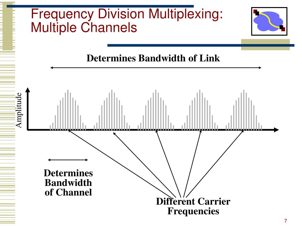 Frequency Division Multiplexing:Multiple Channels Determines Bandwidth of Link Amplitude Determines Bandwidth of Channel Different Carrier Frequencies