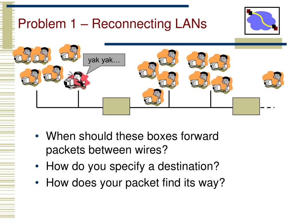 Problem 1 – Reconnecting LANs • When should these boxes forward packets between wires? • How do you specify a destination? • How does your packet find its way? yak yak…