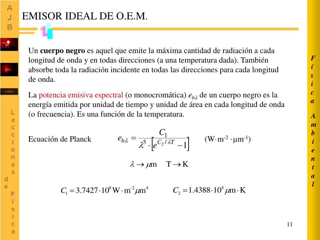 Física Ambiental EMISOR IDEAL DE O.E.M. Un cuerpo negro es aquel que emite la máxima cantidad de radiación a cada longitud de onda y en todas direcciones (a una temperatura dada). También absorbe toda la radiación incidente en todas las direcciones para cada longitud de onda. La potencia emisiva espectral (o monocromática) eb de un cuerpo negro es la energía emitida por unidad de tiempo y unidad de área en cada longitud de onda (o frecuencia). Es una función de la temperatura. Ecuación de Planck (W·m-2 ·m-1)