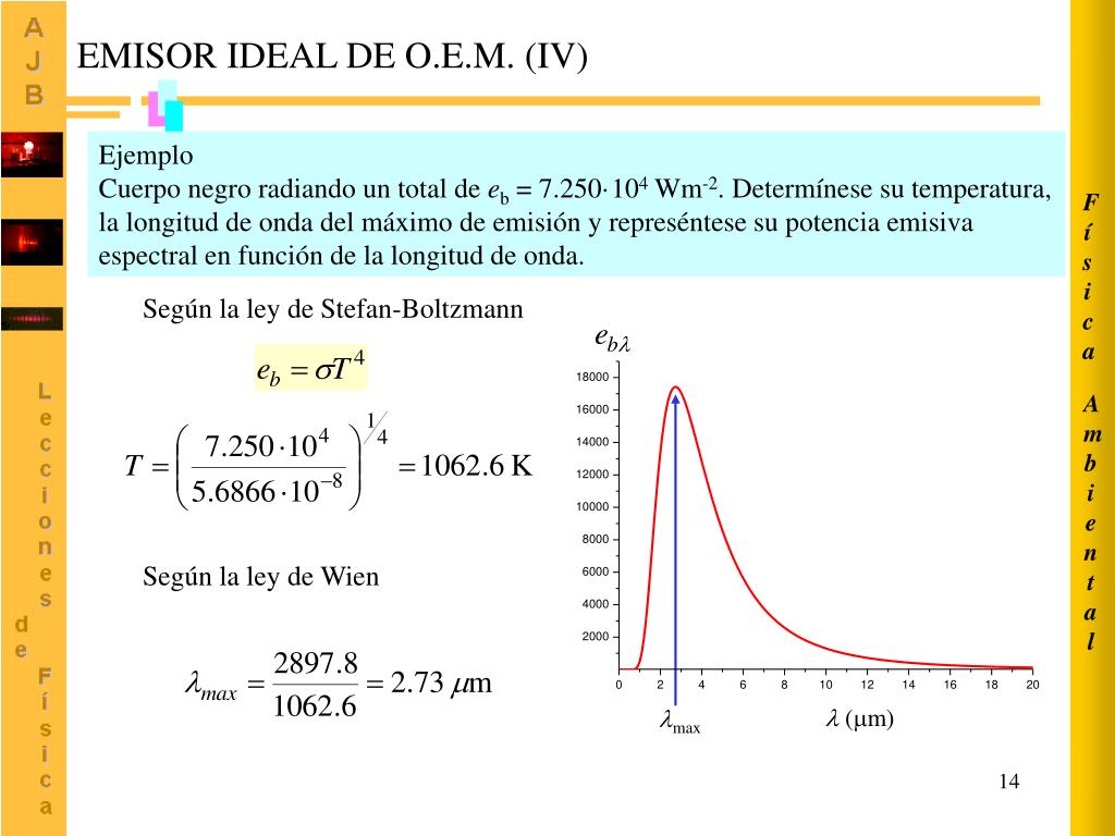 Física Ambiental EMISOR IDEAL DE O.E.M. (III) Ley de Stefan-Boltzmann La potencia emisiva de un cuerpo negro dentro de un ancho de banda d es eb·d. La potencia emisiva total eb es la radiación que abandona el cuerpo negro a todas las longitudes de onda, y está dada por: (W·m-2) Constante de Stefan-Boltzmann = 5.6866·10-8 W·m-2K-4 Ley de desplazamiento de Wien La longitud de onda correspondiente al máximo de emisión es inversamente proporcional a la temperatura. (m)