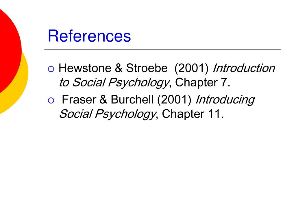 References • Hewstone & Stroebe (2001) Introduction to Social Psychology, Chapter 7. • Fraser & Burchell (2001) Introducing Social Psychology, Chapter 11.