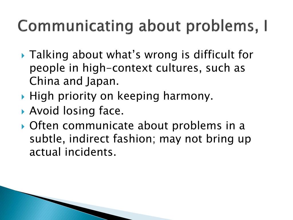Communicating about problems, I • Talking about what’s wrong is difficult for people in high-context cultures, such as China and Japan. • High priority on keeping harmony. • Avoid losing face. • Often communicate about problems in a subtle, indirect fashion; may not bring up actual incidents.