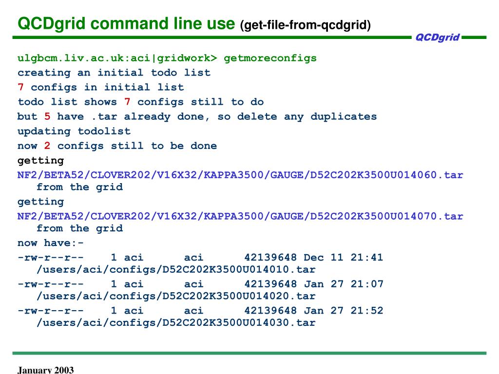 QCDgrid middleware (Globus 2.0, Linux 7.x) • Grid administration • control-thread.sh • add-qcdgrid-node • disable-qcdgrid-node • enable-qcdgrid-node • remove-qcdgrid-node • retire-qcdgrid-node • unretire-qcdgrid-node • get-disk-space • qcdgrid-checksum • qcdgrid-filetime • rebuild-qcdgrid-rc • create-qcdgrid-rc • delete-qcdgrid-rc • verify-qcdgrid-rc • Configuration • qcdgrid.conf • nodes.conf • nodeprefs.conf • User commands • qcdgrid-list • put-file-on-qcdgrid • get-file-from-qcdgrid • i-like-this-file • qcdgrid-delete