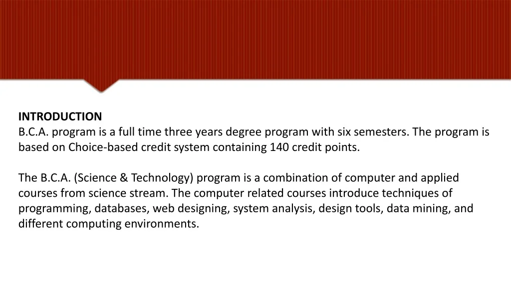 INTRODUCTION B.C.A. program is a full time three years degree program with six semesters. The program is based on Choice-based credit system containing 140 credit points. The B.C.A. (Science & Technology) program is a combination of computer and applied courses from science stream. The computer related courses introduce techniques of programming, databases, web designing, system analysis, design tools, data mining, and different computing environments.