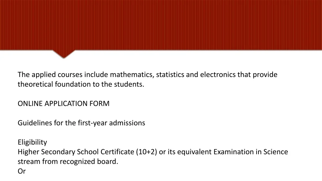 The applied courses include mathematics, statistics and electronics that provide theoretical foundation to the students. ONLINE APPLICATION FORM Guidelines for the first-year admissions Eligibility Higher Secondary School Certificate (10+2) or its equivalent Examination in Science stream from recognized board. Or