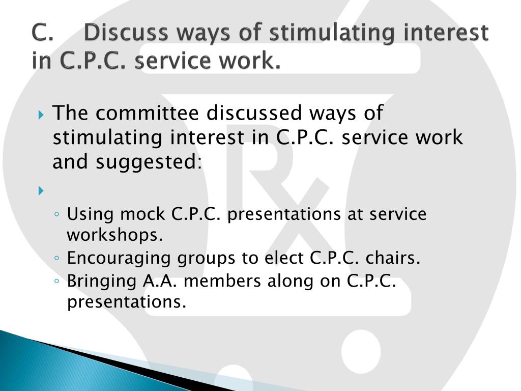 C. Discuss ways of stimulating interest in C.P.C. service work. • The committee discussed ways of stimulating interest in C.P.C. service work and suggested: • Using mock C.P.C. presentations at service workshops. • Encouraging groups to elect C.P.C. chairs. • Bringing A.A. members along on C.P.C. presentations.