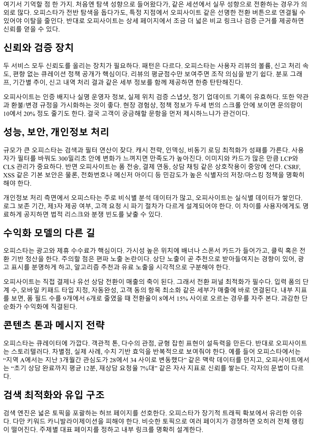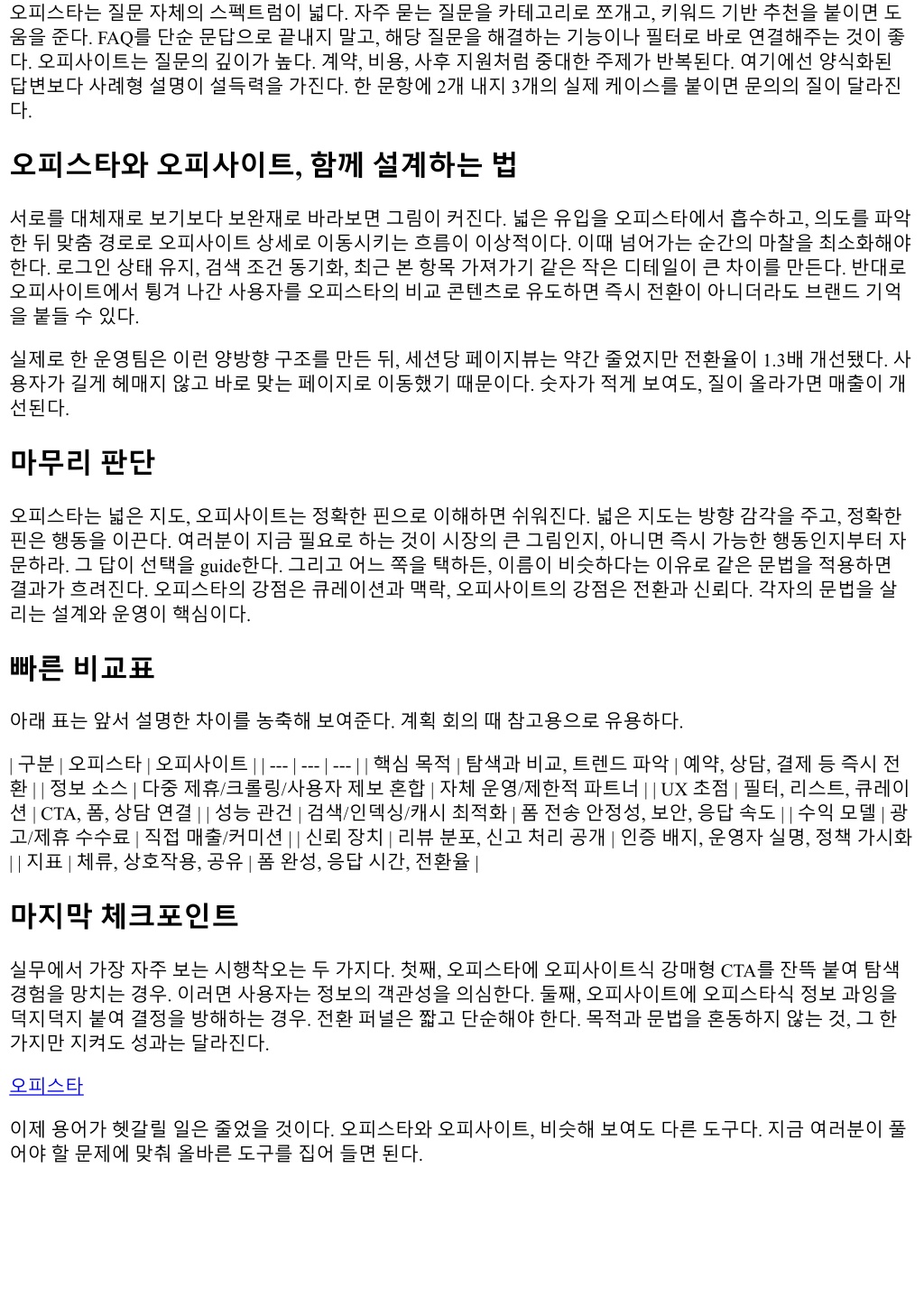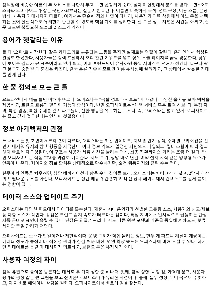 오피스타는질문자체의스펙트럼이넓다. 자주묻는질문을카테고리로쪼개고, 키워드기반추천을붙이면도 움을준다. FAQ를단순문답으로끝내지말고, 해당질문을해결하는기능이나필터로바로연결해주는것이좋 다. 오피사이트는질문의깊이가높다. 계약, 비용, 사후지원처럼중대한주제가반복된다. 여기에선양식화된 답변보다사례형설명이설득력을가진다. 한문항에 2개내지 3개의실제케이스를붙이면문의의질이달라진 다. 오피스타와오피사이트, 함께설계하는법 서로를대체재로보기보다보완재로바라보면그림이커진다. 넓은유입을오피스타에서흡수하고, 의도를파악 한뒤맞춤경로로오피사이트상세로이동시키는흐름이이상적이다. 이때넘어가는순간의마찰을최소화해야 한다. 로그인상태유지, 검색조건동기화, 최근본항목가져가기같은작은디테일이큰차이를만든다. 반대로 오피사이트에서튕겨나간사용자를오피스타의비교콘텐츠로유도하면즉시전환이아니더라도브랜드기억 을붙들수있다. 실제로한운영팀은이런양방향구조를만든뒤, 세션당페이지뷰는약간줄었지만전환율이 1.3배개선됐다. 사 용자가길게헤매지않고바로맞는페이지로이동했기때문이다. 숫자가적게보여도, 질이올라가면매출이개 선된다. 마무리판단 오피스타는넓은지도, 오피사이트는정확한핀으로이해하면쉬워진다. 넓은지도는방향감각을주고, 정확한 핀은행동을이끈다. 여러분이지금필요로하는것이시장의큰그림인지, 아니면즉시가능한행동인지부터자 문하라. 그답이선택을 guide한다. 그리고어느쪽을택하든, 이름이비슷하다는이유로같은문법을적용하면 결과가흐려진다. 오피스타의강점은큐레이션과맥락, 오피사이트의강점은전환과신뢰다. 각자의문법을살 리는설계와운영이핵심이다. 빠른비교표 아래표는앞서설명한차이를농축해보여준다. 계획회의때참고용으로유용하다. | 구분 | 오피스타 | 오피사이트 | | --- | --- | --- | | 핵심목적 | 탐색과비교, 트렌드파악 | 예약, 상담, 결제등즉시전 환 | | 정보소스 | 다중제휴/크롤링/사용자제보혼합 | 자체운영/제한적파트너 | | UX 초점 | 필터, 리스트, 큐레이 션 | CTA, 폼, 상담연결 | | 성능관건 | 검색/인덱싱/캐시최적화 | 폼전송안정성, 보안, 응답속도 | | 수익모델 | 광 고/제휴수수료 | 직접매출/커미션 | | 신뢰장치 | 리뷰분포, 신고처리공개 | 인증배지, 운영자실명, 정책가시화 | | 지표 | 체류, 상호작용, 공유 | 폼완성, 응답시간, 전환율 | 마지막체크포인트 실무에서가장자주보는시행착오는두가지다. 첫째, 오피스타에오피사이트식강매형 CTA를잔뜩붙여탐색 경험을망치는경우. 이러면사용자는정보의객관성을의심한다. 둘째, 오피사이트에오피스타식정보과잉을 덕지덕지붙여결정을방해하는경우. 전환퍼널은짧고단순해야한다. 목적과문법을혼동하지않는것, 그한 가지만지켜도성과는달라진다. 오피스타 이제용어가헷갈릴일은줄었을것이다. 오피스타와오피사이트, 비슷해보여도다른도구다. 지금여러분이풀 어야할문제에맞춰올바른도구를집어들면된다.