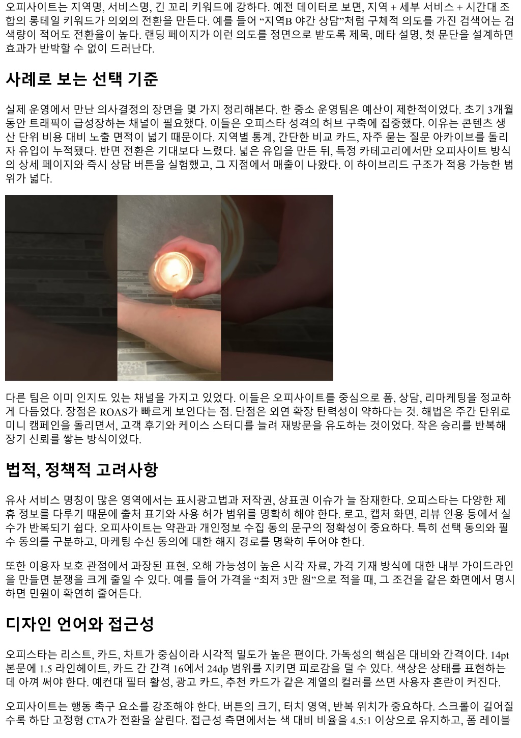 오피사이트는지역명, 서비스명, 긴꼬리키워드에강하다. 예전데이터로보면, 지역 + 세부서비스 + 시간대조 합의롱테일키워드가의외의전환을만든다. 예를들어 “지역B 야간상담”처럼구체적의도를가진검색어는검 색량이적어도전환율이높다. 랜딩페이지가이런의도를정면으로받도록제목, 메타설명, 첫문단을설계하면 효과가반박할수없이드러난다. 사례로보는선택기준 실제운영에서만난의사결정의장면을몇가지정리해본다. 한중소운영팀은예산이제한적이었다. 초기 3개월 동안트래픽이급성장하는채널이필요했다. 이들은오피스타성격의허브구축에집중했다. 이유는콘텐츠생 산단위비용대비노출면적이넓기때문이다. 지역별통계, 간단한비교카드, 자주묻는질문아카이브를돌리 자유입이누적됐다. 반면전환은기대보다느렸다. 넓은유입을만든뒤, 특정카테고리에서만오피사이트방식 의상세페이지와즉시상담버튼을실험했고, 그지점에서매출이나왔다. 이하이브리드구조가적용가능한범 위가넓다. 다른팀은이미인지도있는채널을가지고있었다. 이들은오피사이트를중심으로폼, 상담, 리마케팅을정교하 게다듬었다. 장점은 ROAS가빠르게보인다는점. 단점은외연확장탄력성이약하다는것. 해법은주간단위로 미니캠페인을돌리면서, 고객후기와케이스스터디를늘려재방문을유도하는것이었다. 작은승리를반복해 장기신뢰를쌓는방식이었다. 법적, 정책적고려사항 유사서비스명칭이많은영역에서는표시광고법과저작권, 상표권이슈가늘잠재한다. 오피스타는다양한제 휴정보를다루기때문에출처표기와사용허가범위를명확히해야한다. 로고, 캡처화면, 리뷰인용등에서실 수가반복되기쉽다. 오피사이트는약관과개인정보수집동의문구의정확성이중요하다. 특히선택동의와필 수동의를구분하고, 마케팅수신동의에대한해지경로를명확히두어야한다. 또한이용자보호관점에서과장된표현, 오해가능성이높은시각자료, 가격기재방식에대한내부가이드라인 을만들면분쟁을크게줄일수있다. 예를들어가격을 “최저 3만원”으로적을때, 그조건을같은화면에서명시 하면민원이확연히줄어든다. 디자인언어와접근성 오피스타는리스트, 카드, 차트가중심이라시각적밀도가높은편이다. 가독성의핵심은대비와간격이다. 14pt 본문에 1.5 라인헤이트, 카드간간격 16에서 24dp 범위를지키면피로감을덜수있다. 색상은상태를표현하는 데아껴써야한다. 예컨대필터활성, 광고카드, 추천카드가같은계열의컬러를쓰면사용자혼란이커진다. 오피사이트는행동촉구요소를강조해야한다. 버튼의크기, 터치영역, 반복위치가중요하다. 스크롤이길어질 수록하단고정형 CTA가전환을살린다. 접근성측면에서는색대비비율을 4.5:1 이상으로유지하고, 폼레이블