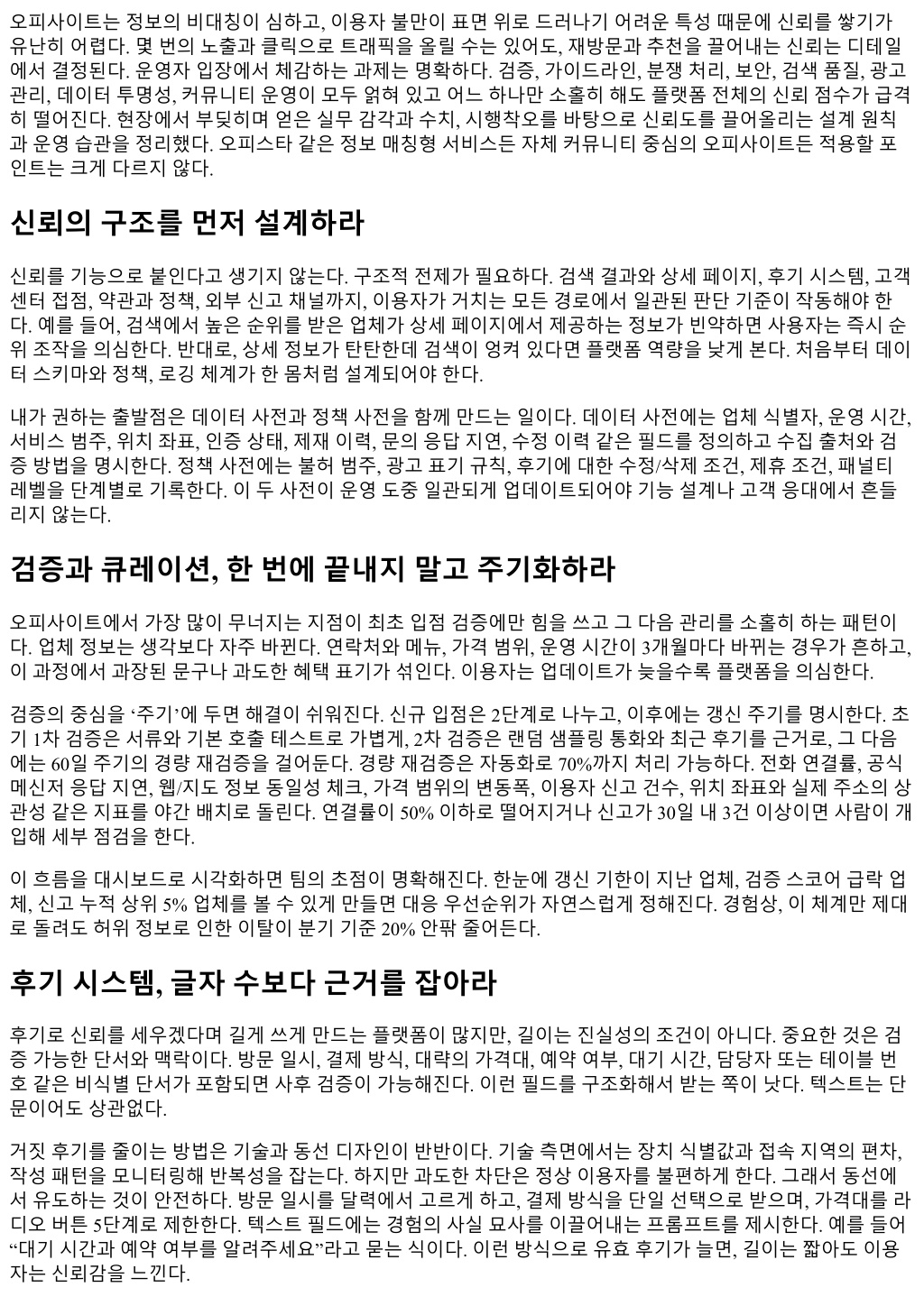 오피사이트는정보의비대칭이심하고, 이용자불만이표면위로드러나기어려운특성때문에신뢰를쌓기가 유난히어렵다. 몇번의노출과클릭으로트래픽을올릴수는있어도, 재방문과추천을끌어내는신뢰는디테일 에서결정된다. 운영자입장에서체감하는과제는명확하다. 검증, 가이드라인, 분쟁처리, 보안, 검색품질, 광고 관리, 데이터투명성, 커뮤니티운영이모두얽혀있고어느하나만소홀히해도플랫폼전체의신뢰점수가급격 히떨어진다. 현장에서부딪히며얻은실무감각과수치, 시행착오를바탕으로신뢰도를끌어올리는설계원칙 과운영습관을정리했다. 오피스타같은정보매칭형서비스든자체커뮤니티중심의오피사이트든적용할포 인트는크게다르지않다. 신뢰의구조를먼저설계하라 신뢰를기능으로붙인다고생기지않는다. 구조적전제가필요하다. 검색결과와상세페이지, 후기시스템, 고객 센터접점, 약관과정책, 외부신고채널까지, 이용자가거치는모든경로에서일관된판단기준이작동해야한 다. 예를들어, 검색에서높은순위를받은업체가상세페이지에서제공하는정보가빈약하면사용자는즉시순 위조작을의심한다. 반대로, 상세정보가탄탄한데검색이엉켜있다면플랫폼역량을낮게본다. 처음부터데이 터스키마와정책, 로깅체계가한몸처럼설계되어야한다. 내가권하는출발점은데이터사전과정책사전을함께만드는일이다. 데이터사전에는업체식별자, 운영시간, 서비스범주, 위치좌표, 인증상태, 제재이력, 문의응답지연, 수정이력같은필드를정의하고수집출처와검 증방법을명시한다. 정책사전에는불허범주, 광고표기규칙, 후기에대한수정/삭제조건, 제휴조건, 패널티 레벨을단계별로기록한다. 이두사전이운영도중일관되게업데이트되어야기능설계나고객응대에서흔들 리지않는다. 검증과큐레이션, 한번에끝내지말고주기화하라 오피사이트에서가장많이무너지는지점이최초입점검증에만힘을쓰고그다음관리를소홀히하는패턴이 다. 업체정보는생각보다자주바뀐다. 연락처와메뉴, 가격범위, 운영시간이 3개월마다바뀌는경우가흔하고, 이과정에서과장된문구나과도한혜택표기가섞인다. 이용자는업데이트가늦을수록플랫폼을의심한다. 검증의중심을 ‘주기’에두면해결이쉬워진다. 신규입점은 2단계로나누고, 이후에는갱신주기를명시한다. 초 기 1차검증은서류와기본호출테스트로가볍게, 2차검증은랜덤샘플링통화와최근후기를근거로, 그다음 에는 60일주기의경량재검증을걸어둔다. 경량재검증은자동화로 70%까지처리가능하다. 전화연결률, 공식 메신저응답지연, 웹/지도정보동일성체크, 가격범위의변동폭, 이용자신고건수, 위치좌표와실제주소의상 관성같은지표를야간배치로돌린다. 연결률이 50% 이하로떨어지거나신고가 30일내 3건이상이면사람이개 입해세부점검을한다. 이흐름을대시보드로시각화하면팀의초점이명확해진다. 한눈에갱신기한이지난업체, 검증스코어급락업 체, 신고누적상위 5% 업체를볼수있게만들면대응우선순위가자연스럽게정해진다. 경험상, 이체계만제대 로돌려도허위정보로인한이탈이분기기준 20% 안팎줄어든다. 후기시스템, 글자수보다근거를잡아라 후기로신뢰를세우겠다며길게쓰게만드는플랫폼이많지만, 길이는진실성의조건이아니다. 중요한것은검 증가능한단서와맥락이다. 방문일시, 결제방식, 대략의가격대, 예약여부, 대기시간, 담당자또는테이블번 호같은비식별단서가포함되면사후검증이가능해진다. 이런필드를구조화해서받는쪽이낫다. 텍스트는단 문이어도상관없다. 거짓후기를줄이는방법은기술과동선디자인이반반이다. 기술측면에서는장치식별값과접속지역의편차, 작성패턴을모니터링해반복성을잡는다. 하지만과도한차단은정상이용자를불편하게한다. 그래서동선에 서유도하는것이안전하다. 방문일시를달력에서고르게하고, 결제방식을단일선택으로받으며, 가격대를라 디오버튼 5단계로제한한다. 텍스트필드에는경험의사실묘사를이끌어내는프롬프트를제시한다. 예를들어 “대기시간과예약여부를알려주세요”라고묻는식이다. 이런방식으로유효후기가늘면, 길이는짧아도이용 자는신뢰감을느낀다.