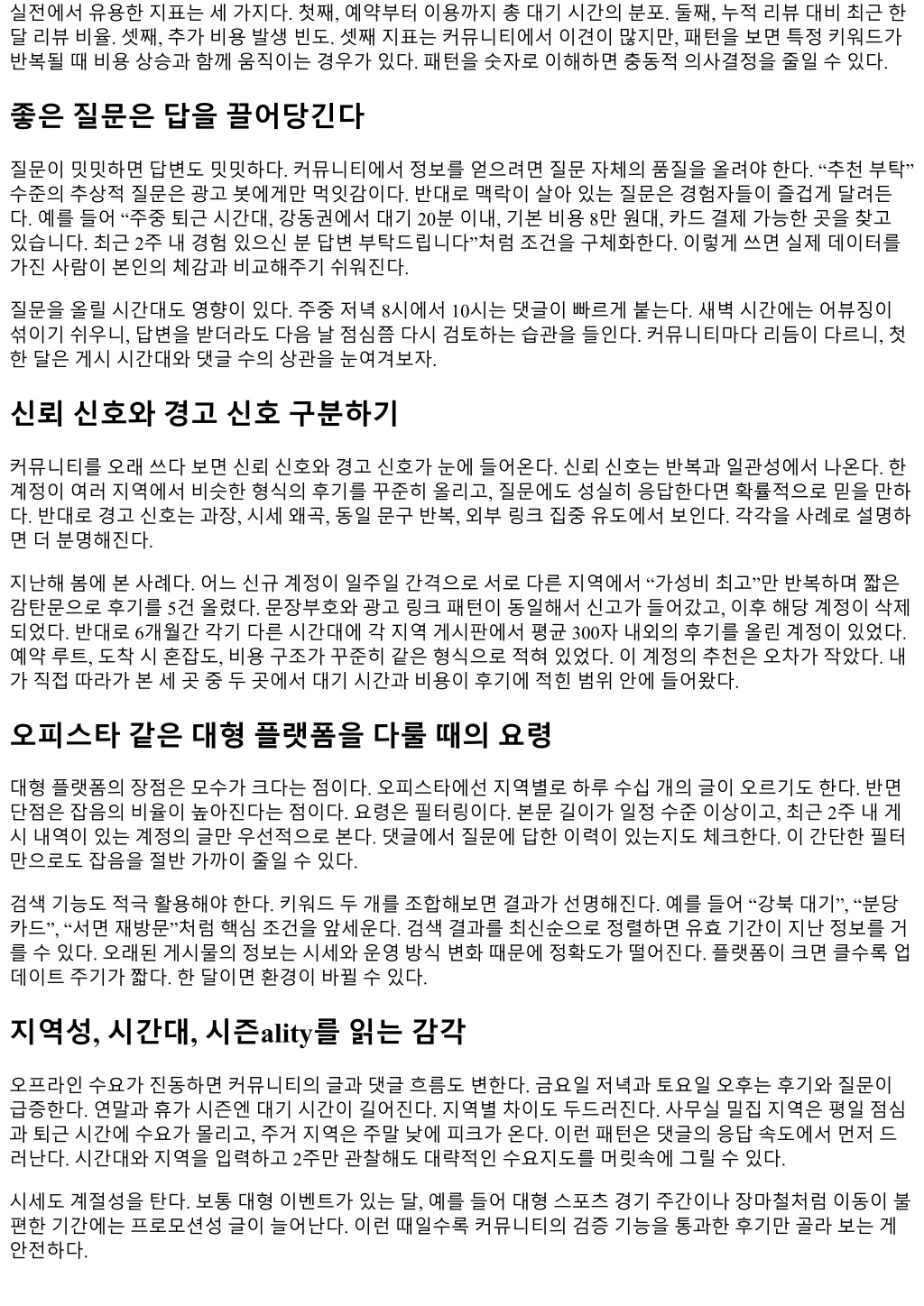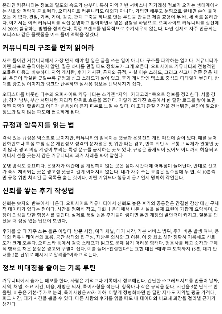 실전에서유용한지표는세가지다. 첫째, 예약부터이용까지총대기시간의분포. 둘째, 누적리뷰대비최근한 달리뷰비율. 셋째, 추가비용발생빈도. 셋째지표는커뮤니티에서이견이많지만, 패턴을보면특정키워드가 반복될때비용상승과함께움직이는경우가있다. 패턴을숫자로이해하면충동적의사결정을줄일수있다. 좋은질문은답을끌어당긴다 질문이밋밋하면답변도밋밋하다. 커뮤니티에서정보를얻으려면질문자체의품질을올려야한다. “추천부탁” 수준의추상적질문은광고봇에게만먹잇감이다. 반대로맥락이살아있는질문은경험자들이즐겁게달려든 다. 예를들어 “주중퇴근시간대, 강동권에서대기 20분이내, 기본비용 8만원대, 카드결제가능한곳을찾고 있습니다. 최근 2주내경험있으신분답변부탁드립니다”처럼조건을구체화한다. 이렇게쓰면실제데이터를 가진사람이본인의체감과비교해주기쉬워진다. 질문을올릴시간대도영향이있다. 주중저녁 8시에서 10시는댓글이빠르게붙는다. 새벽시간에는어뷰징이 섞이기쉬우니, 답변을받더라도다음날점심쯤다시검토하는습관을들인다. 커뮤니티마다리듬이다르니, 첫 한달은게시시간대와댓글수의상관을눈여겨보자. 신뢰신호와경고신호구분하기 커뮤니티를오래쓰다보면신뢰신호와경고신호가눈에들어온다. 신뢰신호는반복과일관성에서나온다. 한 계정이여러지역에서비슷한형식의후기를꾸준히올리고, 질문에도성실히응답한다면확률적으로믿을만하 다. 반대로경고신호는과장, 시세왜곡, 동일문구반복, 외부링크집중유도에서보인다. 각각을사례로설명하 면더분명해진다. 지난해봄에본사례다. 어느신규계정이일주일간격으로서로다른지역에서 “가성비최고”만반복하며짧은 감탄문으로후기를 5건올렸다. 문장부호와광고링크패턴이동일해서신고가들어갔고, 이후해당계정이삭제 되었다. 반대로 6개월간각기다른시간대에각지역게시판에서평균 300자내외의후기를올린계정이있었다. 예약루트, 도착시혼잡도, 비용구조가꾸준히같은형식으로적혀있었다. 이계정의추천은오차가작았다. 내 가직접따라가본세곳중두곳에서대기시간과비용이후기에적힌범위안에들어왔다. 오피스타같은대형플랫폼을다룰때의요령 대형플랫폼의장점은모수가크다는점이다. 오피스타에선지역별로하루수십개의글이오르기도한다. 반면 단점은잡음의비율이높아진다는점이다. 요령은필터링이다. 본문길이가일정수준이상이고, 최근 2주내게 시내역이있는계정의글만우선적으로본다. 댓글에서질문에답한이력이있는지도체크한다. 이간단한필터 만으로도잡음을절반가까이줄일수있다. 검색기능도적극활용해야한다. 키워드두개를조합해보면결과가선명해진다. 예를들어 “강북대기”, “분당 카드”, “서면재방문”처럼핵심조건을앞세운다. 검색결과를최신순으로정렬하면유효기간이지난정보를거 를수있다. 오래된게시물의정보는시세와운영방식변화때문에정확도가떨어진다. 플랫폼이크면클수록업 데이트주기가짧다. 한달이면환경이바뀔수있다. 지역성, 시간대, 시즌ality를읽는감각 오프라인수요가진동하면커뮤니티의글과댓글흐름도변한다. 금요일저녁과토요일오후는후기와질문이 급증한다. 연말과휴가시즌엔대기시간이길어진다. 지역별차이도두드러진다. 사무실밀집지역은평일점심 과퇴근시간에수요가몰리고, 주거지역은주말낮에피크가온다. 이런패턴은댓글의응답속도에서먼저드 러난다. 시간대와지역을입력하고 2주만관찰해도대략적인수요지도를머릿속에그릴수있다. 시세도계절성을탄다. 보통대형이벤트가있는달, 예를들어대형스포츠경기주간이나장마철처럼이동이불 편한기간에는프로모션성글이늘어난다. 이런때일수록커뮤니티의검증기능을통과한후기만골라보는게 안전하다.